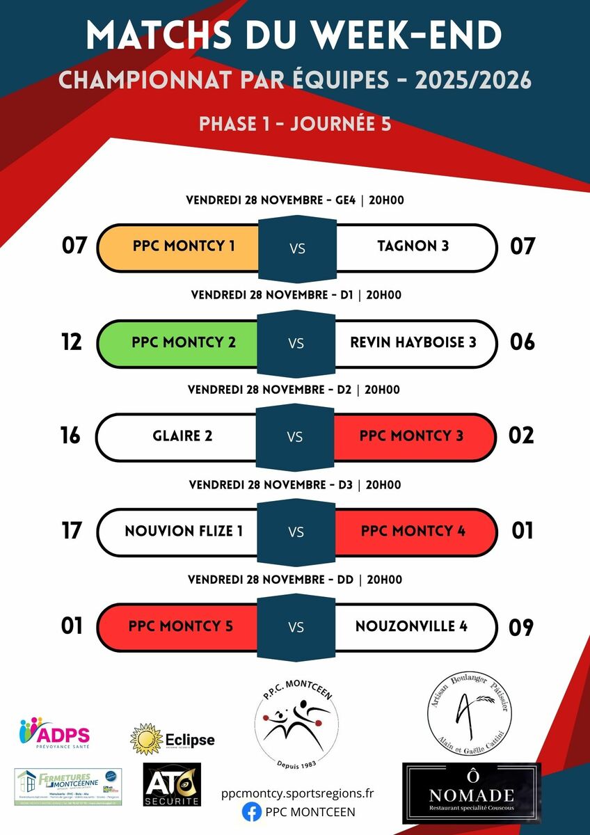 Rendez-vous le vendredi 12 et samedi 13 décembre pour l'avant dernier match par équipe de la première phase et le dernier de l'année ![]()